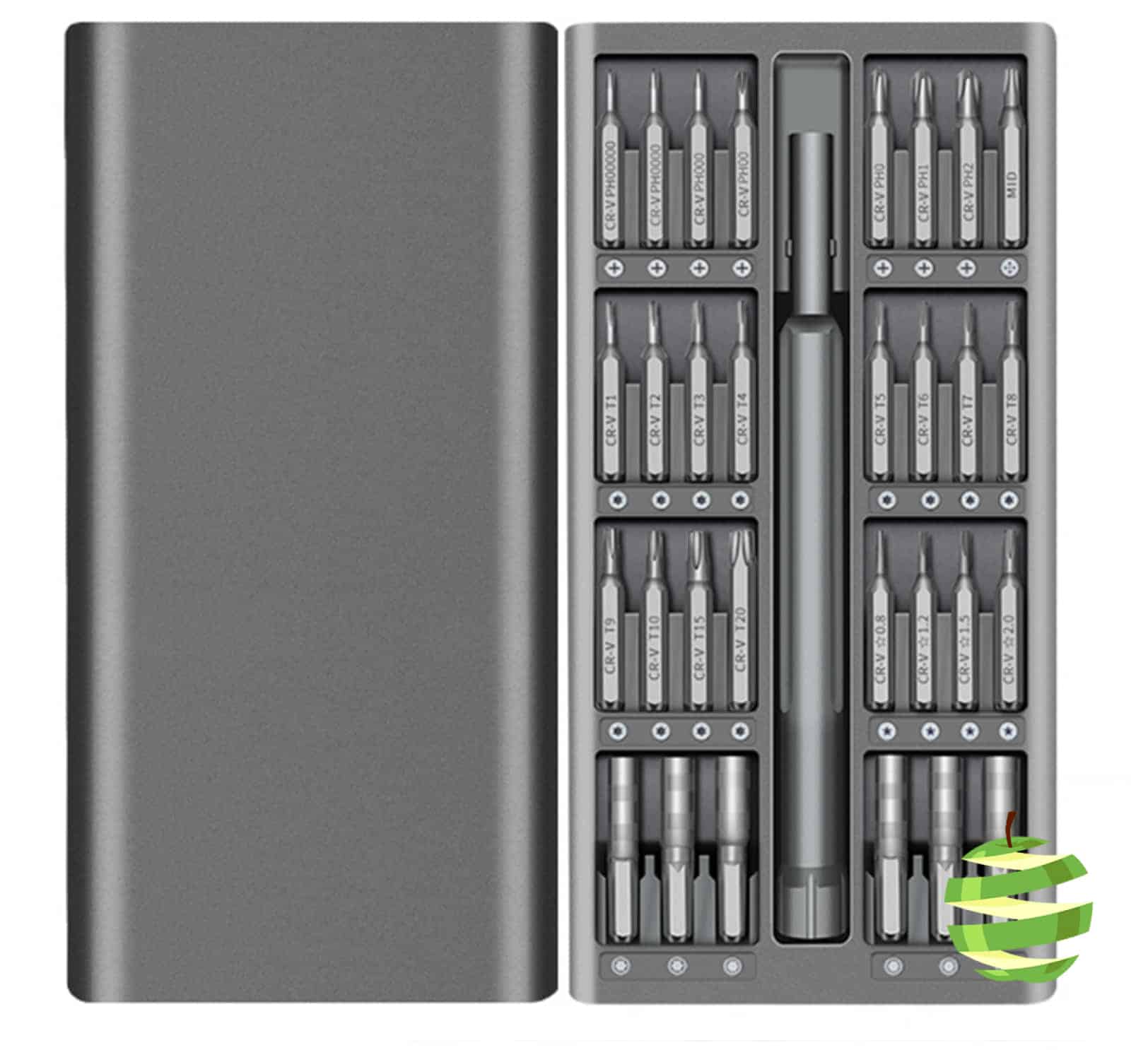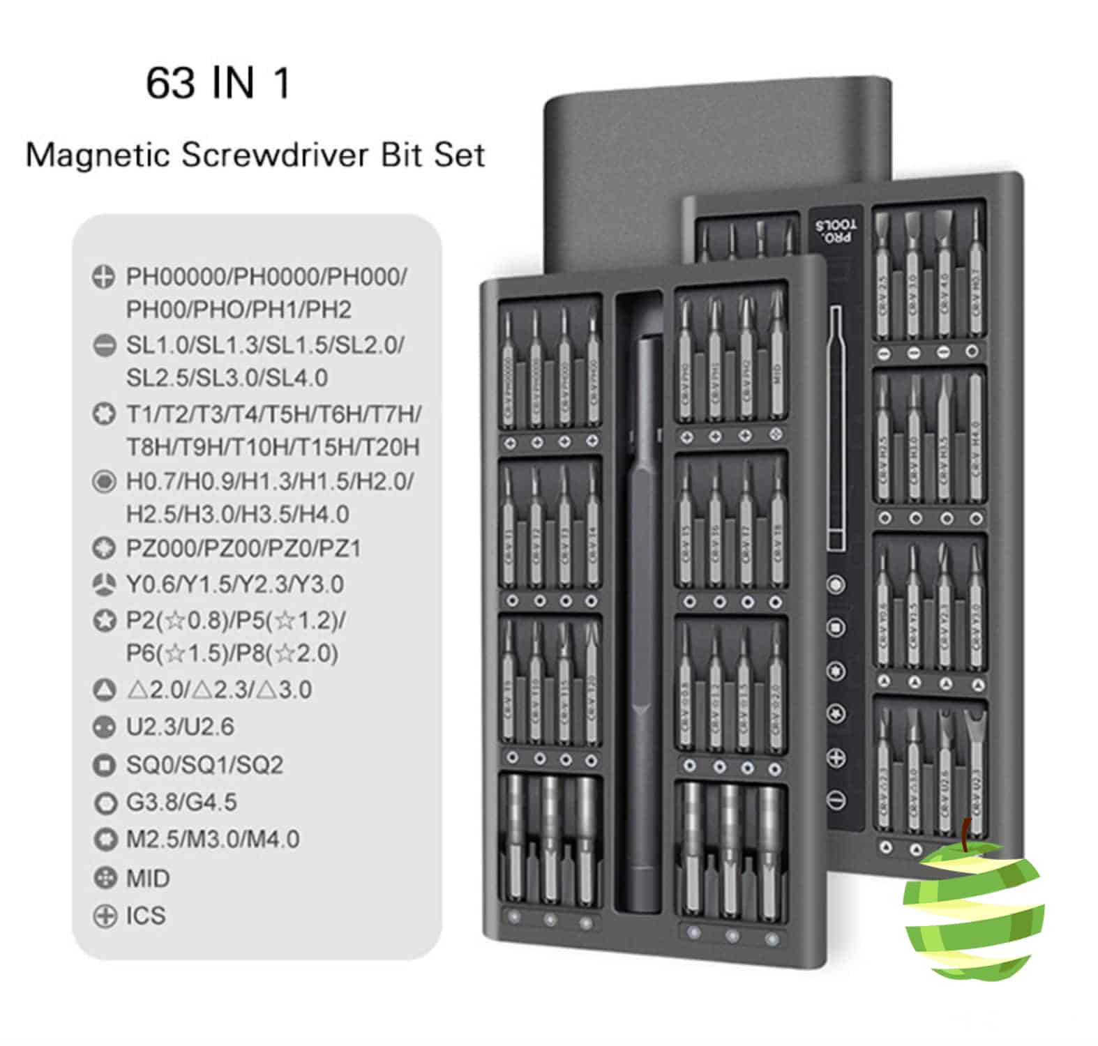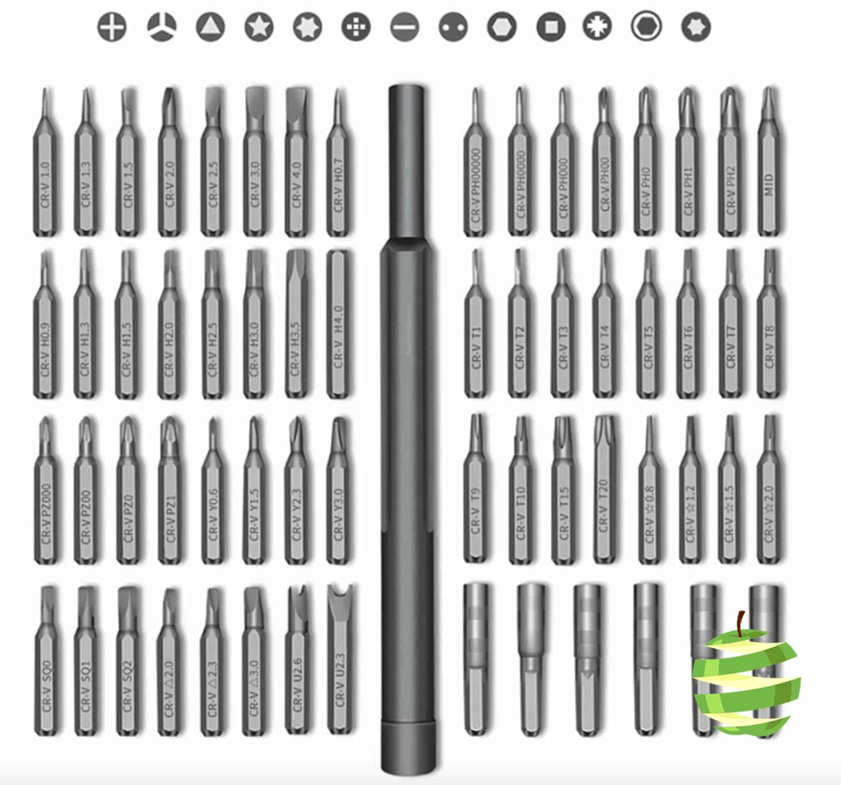 - 63 embouts de différentes formes : 7 cruciformes (1.0, 1.5, 2.0, 2.5, 3.0, 3.5, 4.0), 5 plats (1.0, 1.5, 2.0, 2.5, 3.5), 11 vis-étoiles (T2, T3, T4, T5, T6, T7, T8, T9, T10, T15, T20), 11 à six pans (0.7, 0.9, 1.3, 1.5, 2.0, 2.5, 3.0, 4.0, 4.5, 5.0, 6.0), 3 Tri-point (Y0.6, Y2.0, Y2.5), 3 Pentalobe (0.8, 1.2, 1.5), 3 carrés (S0, S1, S2), 2 de type U (2.6, 3.0), 2 triangulaires (2.0, 3.0), 1 circulaire (0.8), 1 embout cruciforme avec pointe pour iPhone, 7 porte-embouts (M2.5, M3.0, M3.5, M4.0, M4.5, M5.0, M5.5), embout PH2